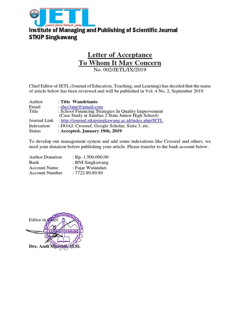 Letter of acceptance (loa) / surat penerimaan artikel yang menyatakan bahwa artikel . Persyaratan verifikasi publikasi di jurnal : Nim / nip / nik :. Itulah contoh loa jurnal yang bisa anda dapatkan ketika ingin mempublikasikan artikel pada penerbit jurnal. Dunia penerbitan jurnal kini menawarkan pilihan publikasi jurnal cepat untuk artikel anda.